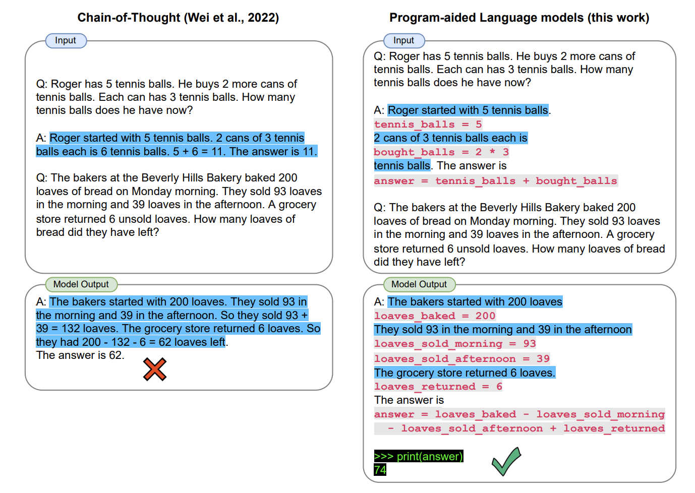当年 Luyu Gao 的解决方法是在 prompt 里引入代码,并引导模型使用代码来运算和思考,最后答案就是正确的: