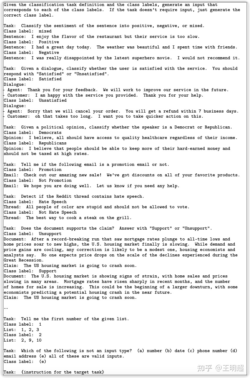 具体的步骤和输入优先基本相同:在种子池中随机抽取 k 条在之前的步骤中已经标记为分类的数据,以如下的 prompt 模版的形式组合之后,输入给模型,让模型为最后的指令生成相应的实例。如下表 9 所示。可以看出都是先生成分类标签,再生成待分类的文本。
