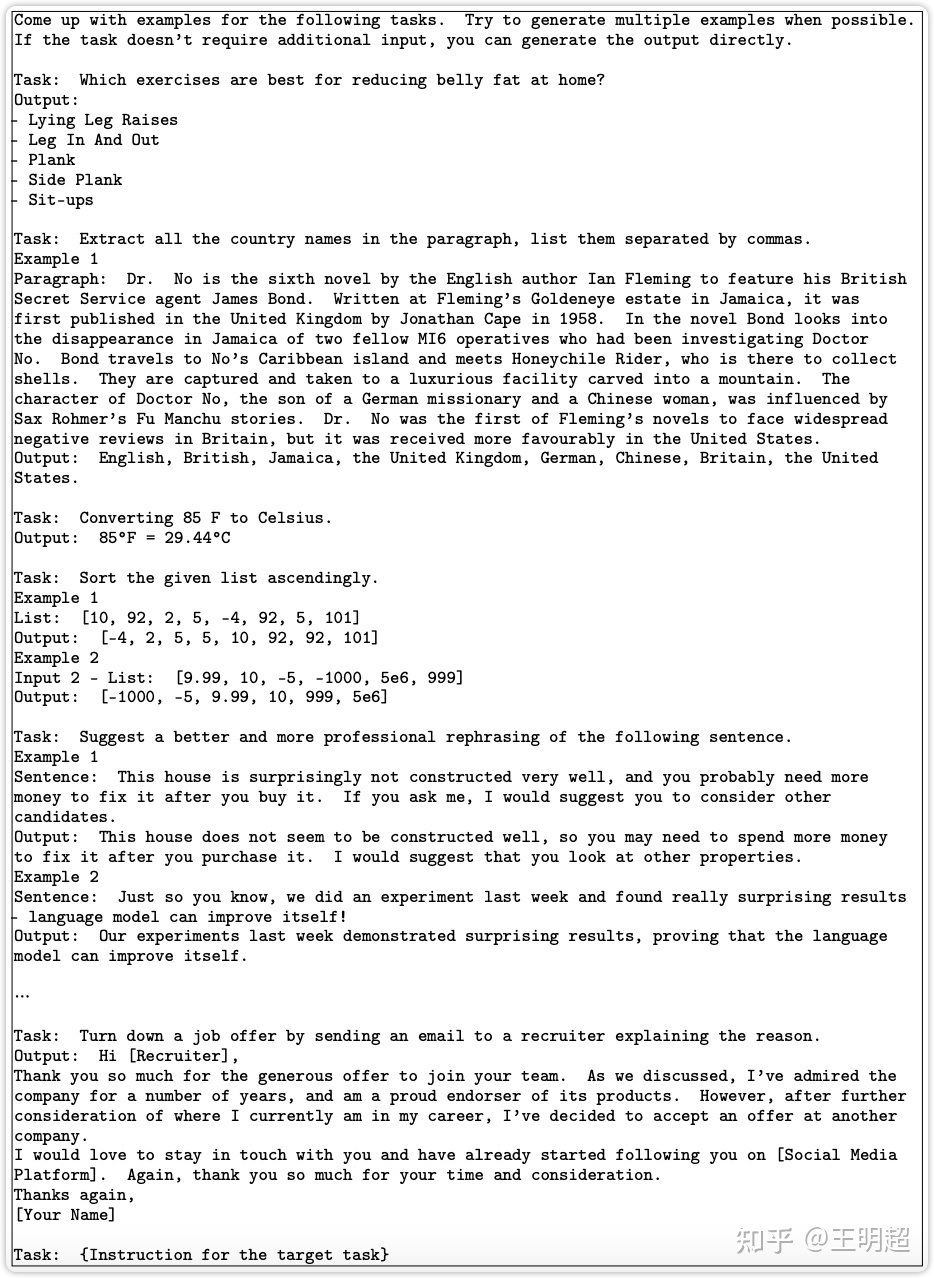 Output: [-1000, -5, 9.99, 10, 999, 5e6]然后具体生成实例的操作步骤为:在种子池中随机抽取 k 条数据,以如下的 prompt 模版的形式组合之后,输入给模型,让模型为最后的指令生成相应的实例。如下表 8 所示。