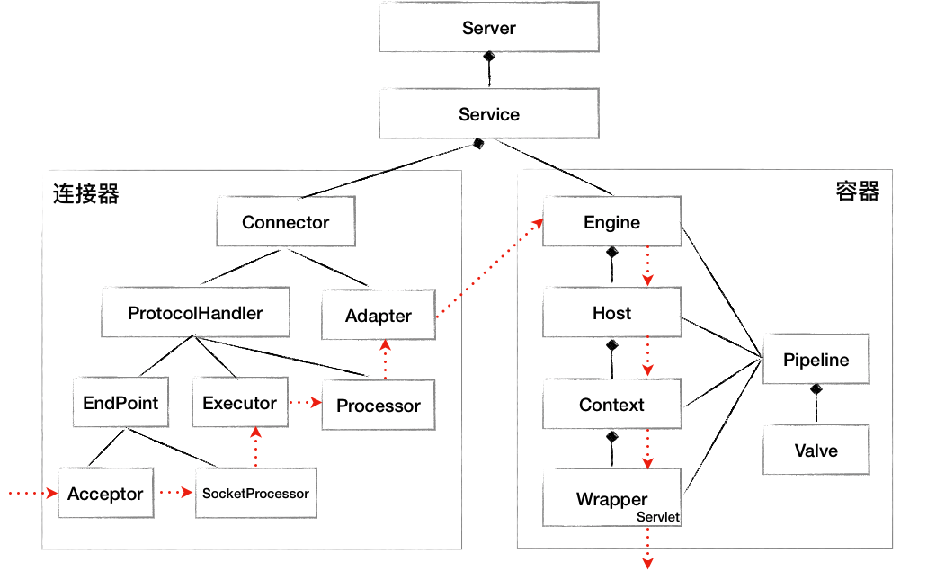 从图中我们看到,EndPoint 接收到 Socket 连接后,生成一个 SocketProcessor 任务提交到线程池去处理,SocketProcessor 的 Run 方法会调用 HttpProcessor 组件去解析应用层协议,Processor 通过解析生成 Request 对象后,会调用 Adapter 的 Service 方法,方法内部通过 以下代码将请求传递到容器中。