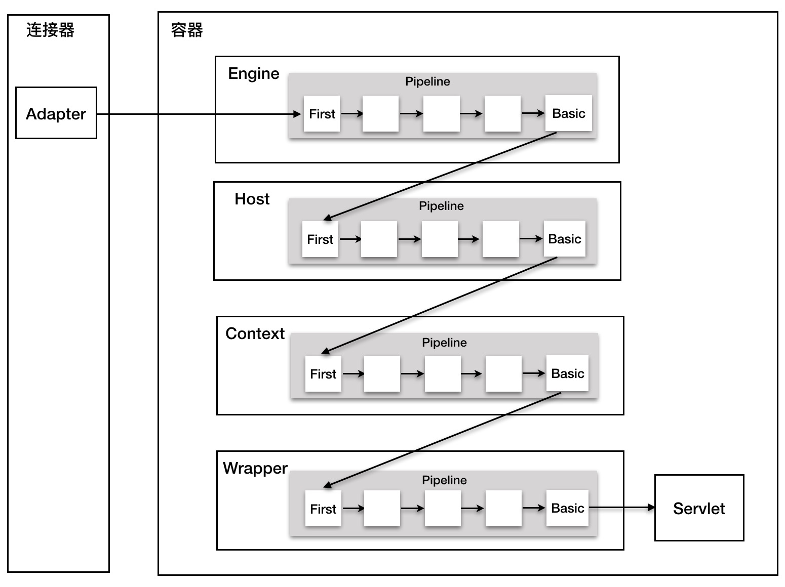 • Container: 多个连接器对应一个容器,顶层容器其实就是 Engine。
