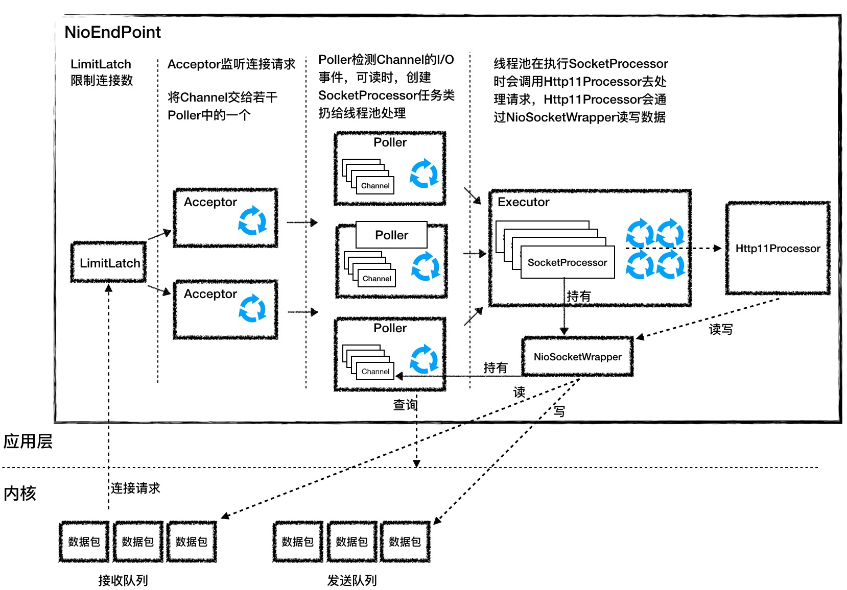 在 Tomcat 中 NioEndpoint 则是 AbstractEndpoint 的具体实现,里面组件虽然很多,但是处理逻辑还是前面两步。它一共包含 LimitLatchAcceptorPollerSocketProcessorExecutor 共 5 个组件,分别分工合作实现整个 TCP/IP 协议的处理。