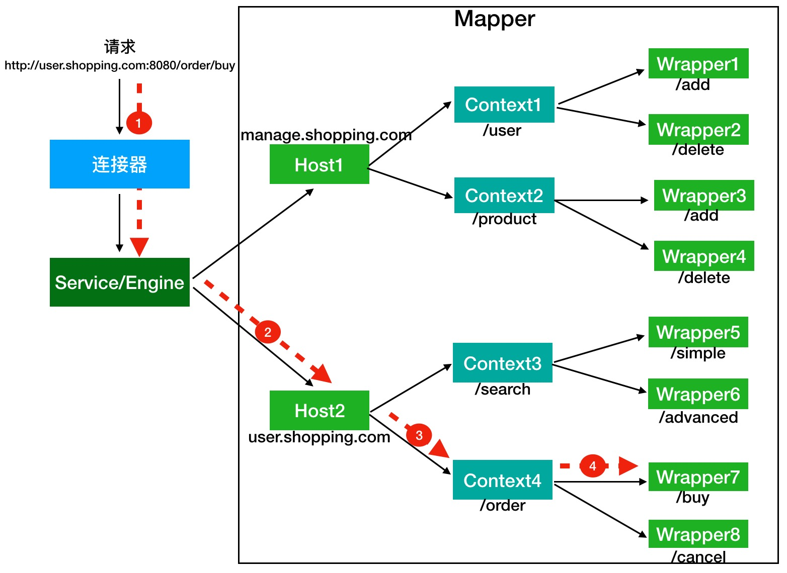Wrapper 表示一个 ServletContext 表示一个 Web 应用程序,而一个 Web 程序可能有多个 ServletHost 表示一个虚拟主机,或者说一个站点,一个 Tomcat 可以配置多个站点(Host);一个站点( Host) 可以部署多个 Web 应用;Engine 代表 引擎,用于管理多个站点(Host),一个 Service 只能有 一个 Engine