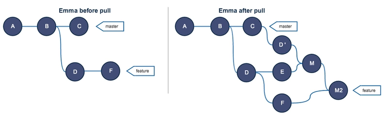 A--B--C--D' origin/feature // GitHub在进行 Pull 操作之后,Git 会进行自动地合并操作,结果大概是这样的: