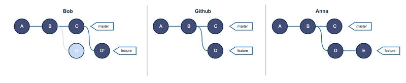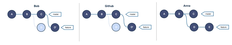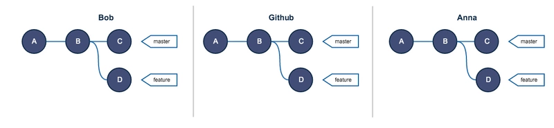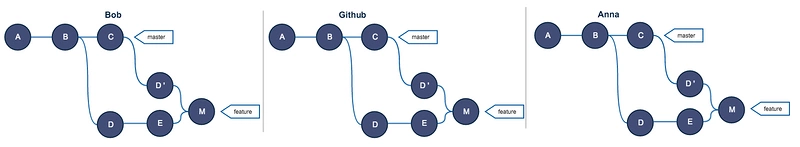 这个第 M 个提交即代表着合并的提交,也就是 Anna 本地的分支与 Github 上的特征分支最终合并的点,现在 Anna 解决了所有的合并冲突并且可以 Push 她的代码,在 Bob 进行 Pull 之后,每个人的 Git Commit 结构为: