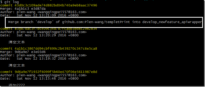 5.当我再 git pull,这将会把 develop_newfeature_authorcheck 分支的修改直接拉下来于本地代码 merge,且产生一个 commit,也就是 merge commit。