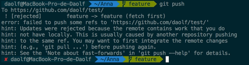 然后呢,当 Anna 也进行推送的时候,她会得到如下的提醒,Git 提醒 Anna 她本地的版本与远程分支并不一致,需要向远端服务器拉取代码进行同步: