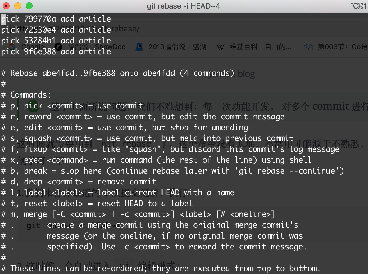 进入编辑模式,第一列为操作指令,第二列为 commit 号,第三列为 commit 信息。
