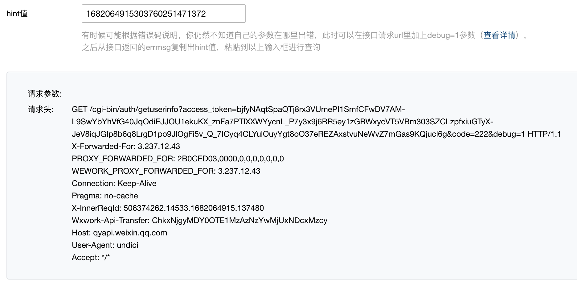 "error is Error: not allow to access from your ip, hint: [1682059359480130799301353], from ip: 34.203.14.222, more info at https://open.work.weixin.qq.com/devtool/query?e=60020"- 因为 API 比较难以定位,所以企业微信提供了相关的方案定位问题